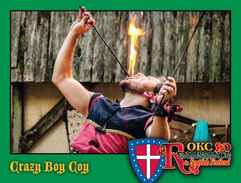 Hear ye, hear ye! Ladies and gentlemen, children of all ages please welcome the one and only Crazy Boy Coy to the OKC Renaissance and Scottish Festival! He’s no stranger to danger and is always sure to draw a crowd. See fire breathing, juggling, death defying acrobatics and much, much more!