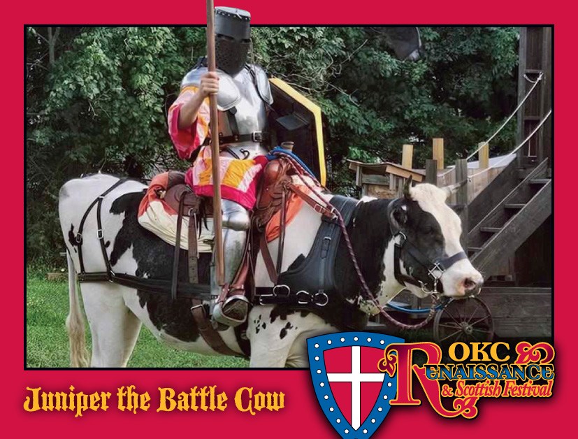 A knight is sworn to valor, a knight’s blade defends the helpless and a knight’s might upholds the weak. Riding upon thundering hooves on a mighty steed crowned with horns of justice, now comes the living legend of…BATTLECOW! The brave knight Sir Nicholas and his trusty steed Juniper the BATTLECOW are riding into the 4th Annual OKC Renaissance and Scottish Festival November 8th and 9th, 2025. Deeds of chivalry await, the wicked will be vanquished as truth, justice and the BATTLECOW way prevail! Huzzah! APPEARING SUDAY ONLY